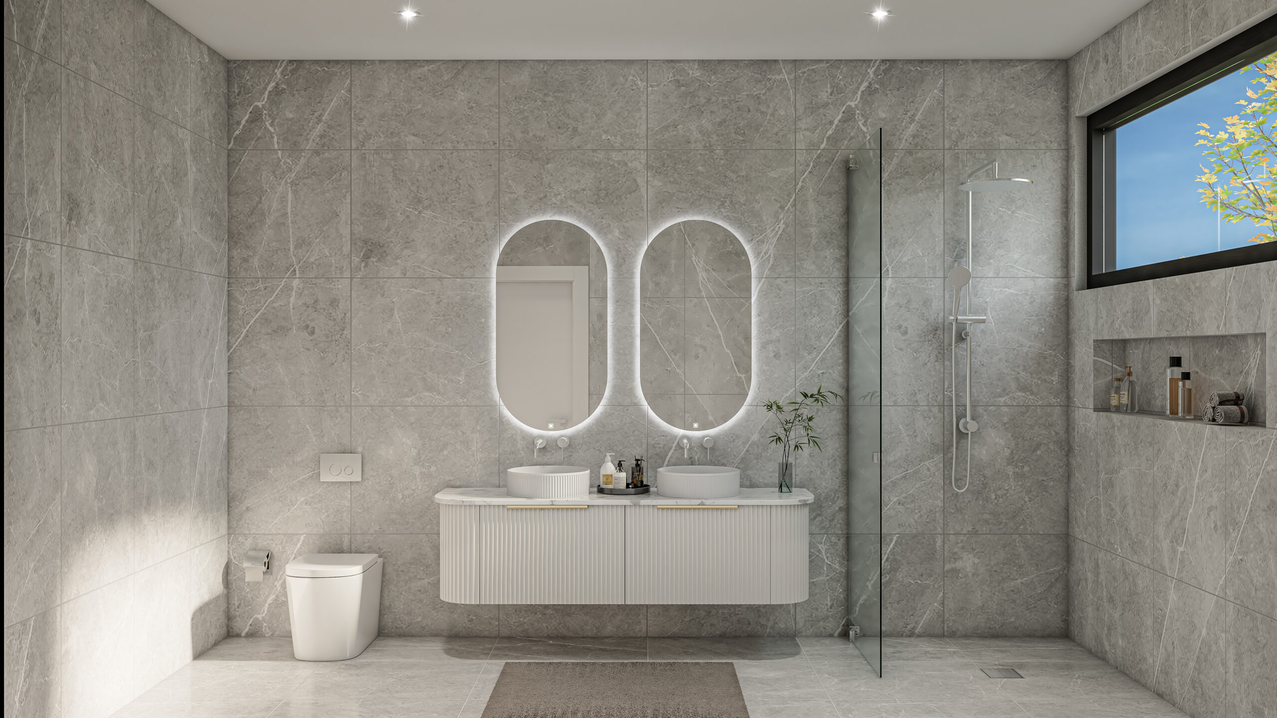 Slip into the master suite, your secluded shore where serenity wraps like a soft horizon. Plush carpets yield underfoot, inviting barefoot ease, while the bespoke walk-in robe safeguards treasures with thoughtful grace. The ensuite unfolds as a spa by the sea: dual stone-topped vanities frame moments of shared quiet, a frameless shower rains gentle renewal, full-height tiles gleam like pearl, and a concealed cistern carves sleek, unburdened lines. Here, routines dissolve into indulgence, each breath a pause in the world’s rush.